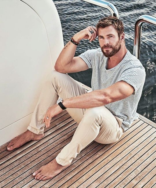 3. Strip blue tee, tan pants, classy watch