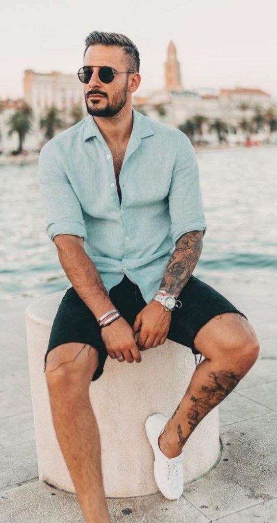 1. Blue line shirt, black denim shorts, flat white sneakers