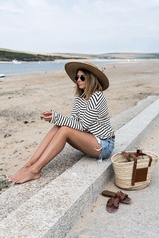 5. Strip long sleeve t-shirt, raw hem denim Short, brown slide sandals, straw wide brim hat, straw tote bag