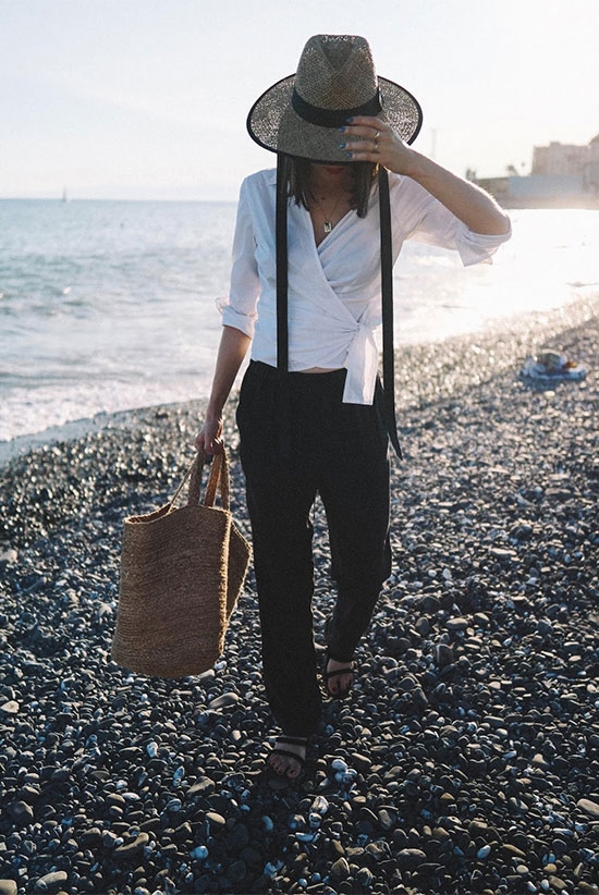 4. White wrap blouse, black linen pants, black slide sandals, black skinny scarf, straw hat
