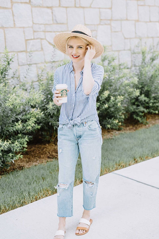 3. Blue stripe shirt , distreassed boyfriend jeans, double strap slide sandals, straw wide brim hat