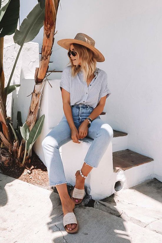 2. Stripe short sleeve shirt, light wash slim crop jeans, woven slide sandals, straw wide brim fedora